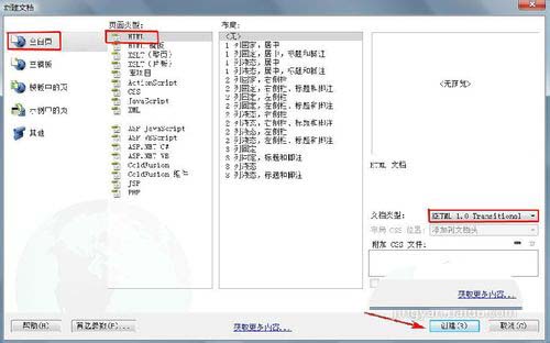 3、在新建文档窗口,选择空白页—HTML,文档类型选择XHTML1.0 transitional,单击创建按钮。