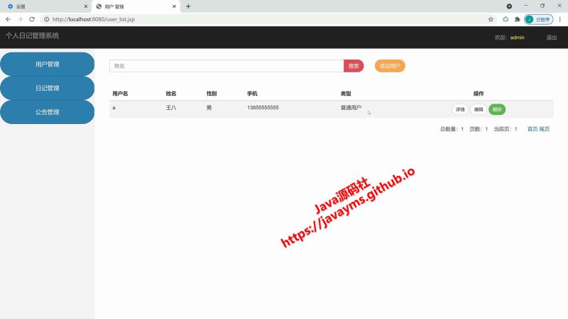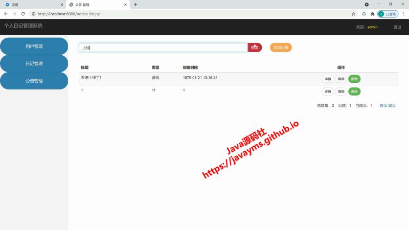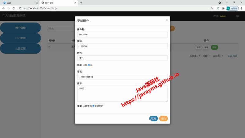 登录、注册、退出、用户模块、公告模块、日记模块的增删改查管理