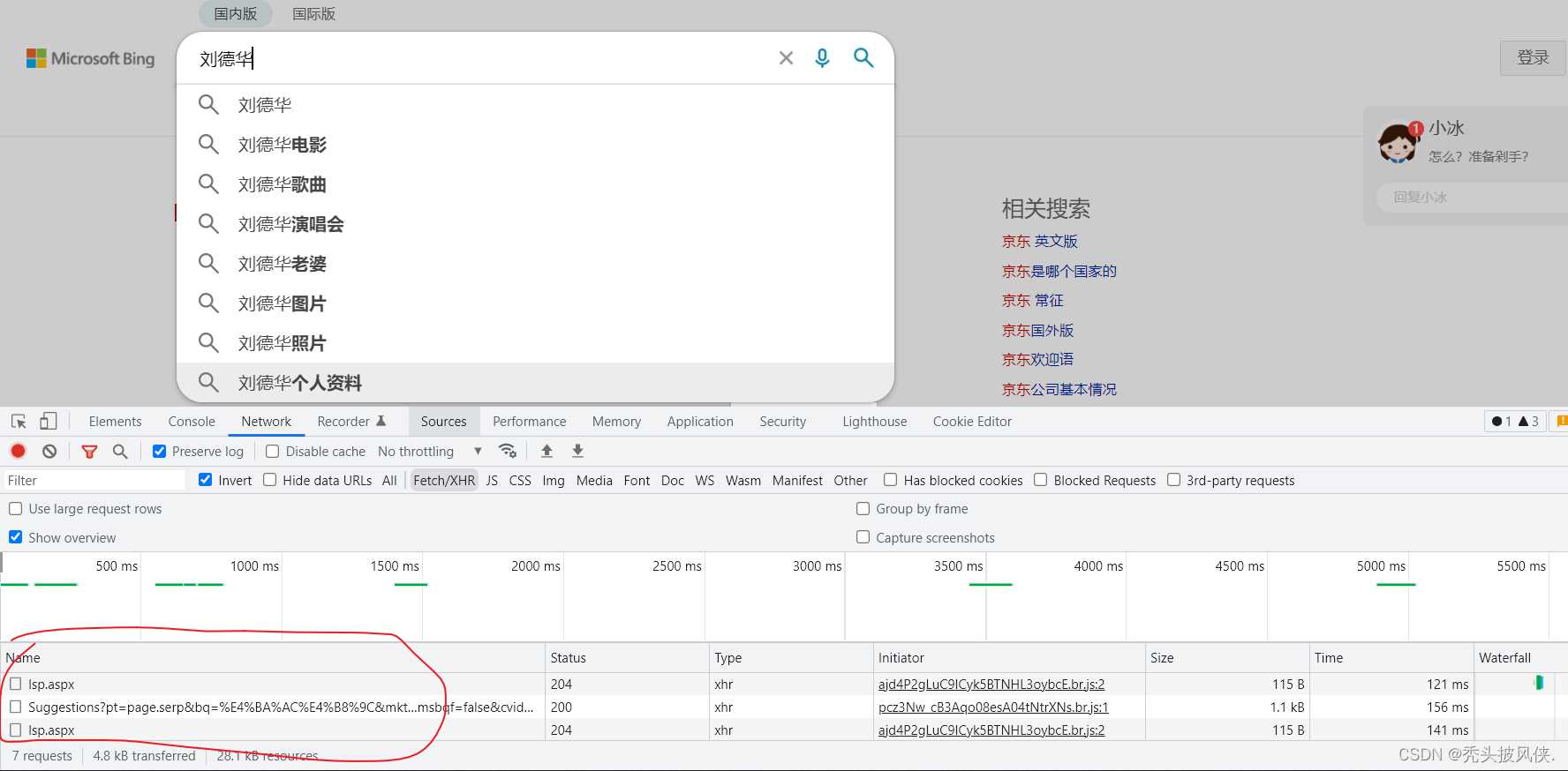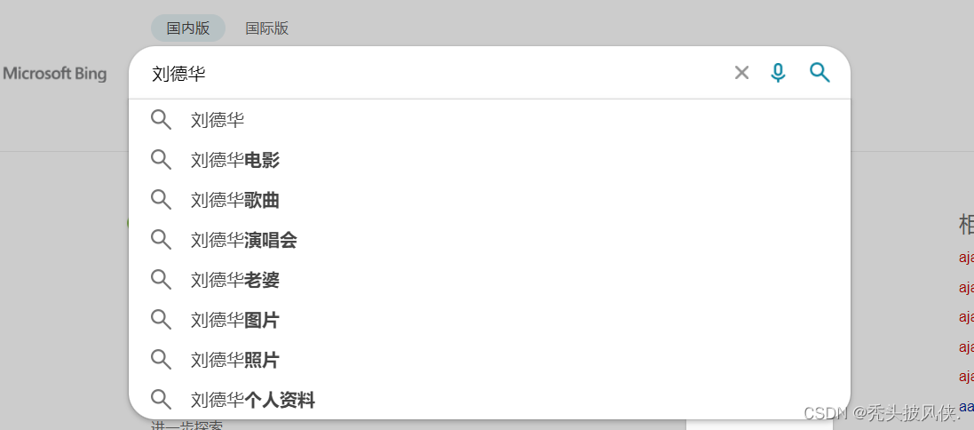 上面是一个搜索框,我们进行搜索的时候,下面就自动进行提示,这就是ajax的典型应用案例,我们只要输入字符,那么就会发送ajax请求,服务器返回数据,页面再进行展示。