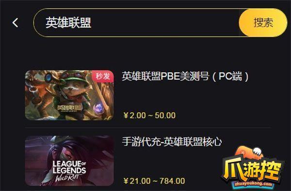 第二步:进入代充网站首页后,点击最上方搜索栏,输入想要购买游戏的关键词“英雄联盟”,然后会出现很多这款游戏的选项,我们选择第一个英雄联盟pbe美测号。