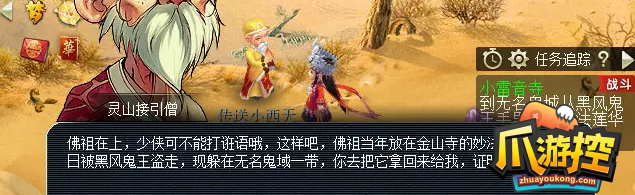 把抢回来的妙法莲华经送还给灵山接引僧以后,他会直接把我们传送至小西天,去小西天(26,206)守门金刚那里让他通报一下,然后金刚说直接进去找阿傩迦叶,忽然想起来阿傩去抓人了,抓人?这是什么情况,只能进去找迦叶登记了。这里要注意,在小西天里一路都会遇怪,所以可以找个过了剧情的号带进去比较快,不然这一路吃香都会遇怪。找到迦叶(小雷音寺80,109)以后触发战斗,对面的怪有感知小怪随机门派,战斗结束后获得450000经验。