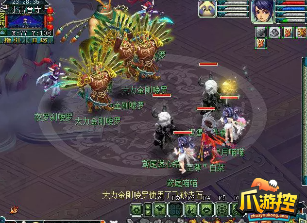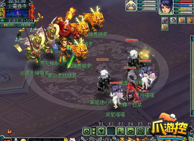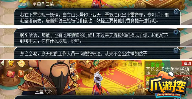 接引僧说是三年前,一个妖怪从东而来,法力高深,还带着一个白色的袋子和一对金饶,举手之间就将和尚打败,然后在后面的山头建了小雷音寺,并命他在此骗取有灵性之人前去给他食用提升道行。先去找玉皇大帝(凌霄宝殿24,40)看看是不是天上什么星宿神兽下凡闹事,玉帝派了一群天兵天将助阵陪着一起去杀回来。回到小雷音寺,找到迦叶直接开打,没想到天兵瞬间被秒飞。必死战斗,【建议不带宝宝不带队友】,死亡无损失。