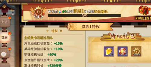 vip的一些奖励:挂机收益+10%英雄经验挂机收益,+10%铜钱挂机收益,10%点金额外铜钱加成,+20%离线挂机时长:+120分钟