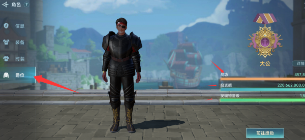 很多船长会问到底怎么冲爵位,我们点开爵位会发现有三个信息战功投资发现物星级
