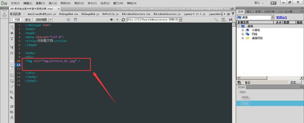 2、在body建立div标签,在div中插入一张图片,如下图所示