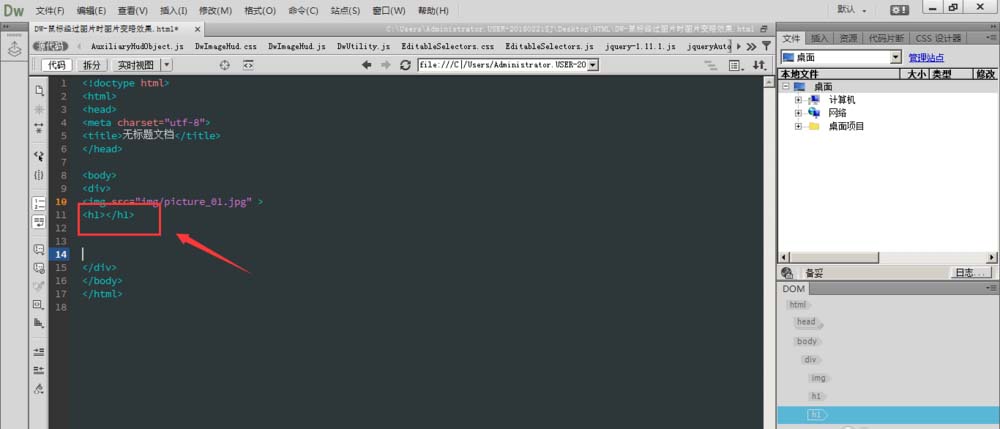 3、在div再建立一个块状标签,新建立的h1和img是同级,都是div的子集,
