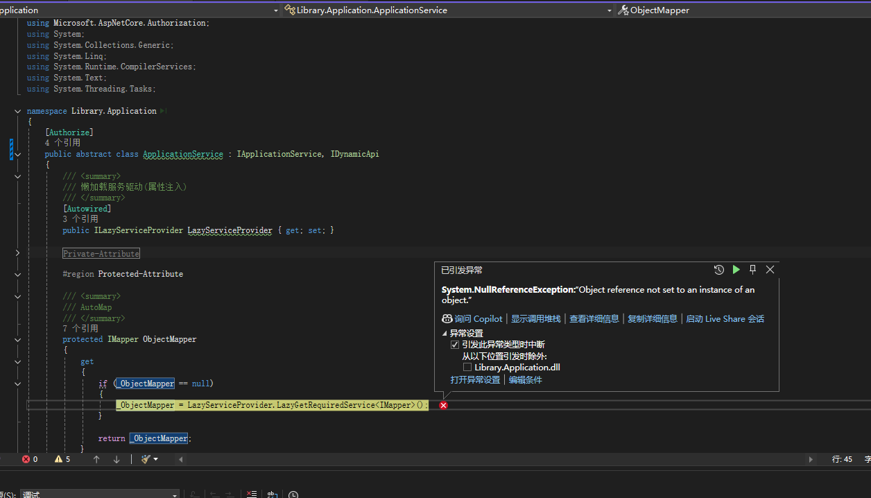 我有一个授权Service【AuthService】继承抽象类【ApplicationService】,程序会后会将所有继承IApplicationService的Service动态转换为Api接口,在swagger使用原生Controller控制器接口调用AuthService是没有问题的,测试【AuthService】的动态接口报错【LazyServiceProvider为null】