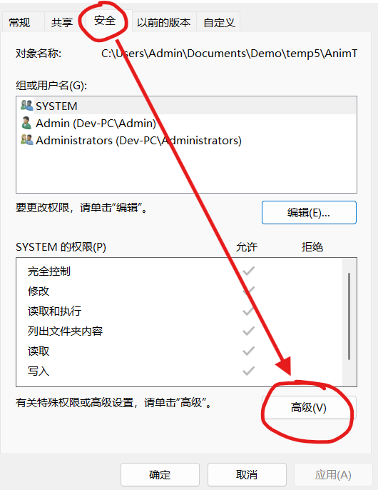 简单说说操作,在目录上右击,打开属性窗口,切换到安全页。点击下面的高级按钮。