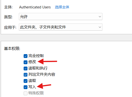 点击选择主体,找到 Authenticated Users 并添加。最起码给予写入和修改权限。