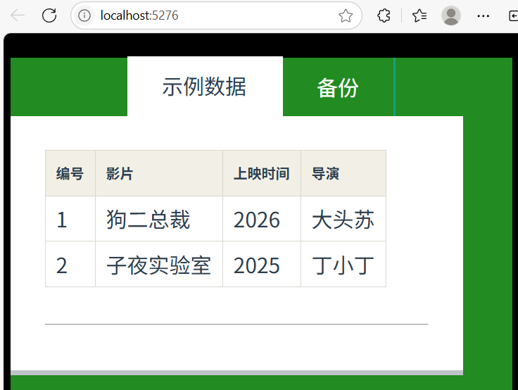 new Movie { Id = 1, Subject = "狗二总裁", Year = 2026, Director = "大头苏", Desc = "二五仔二次创业的励志故事" },