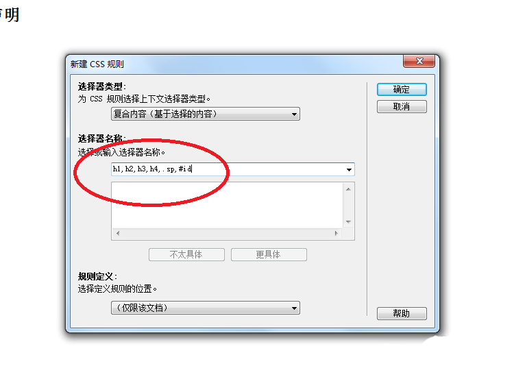 4、在选中器名称中输入刚才设置的所有的元素,中间用,号隔开,比如:h1,h2,h3,h4,.sp,#id,点击确定。