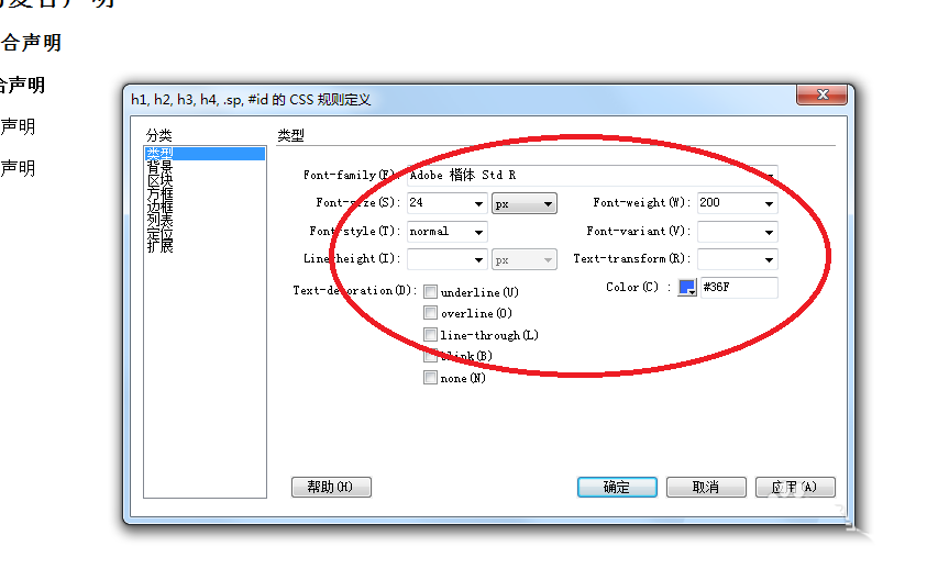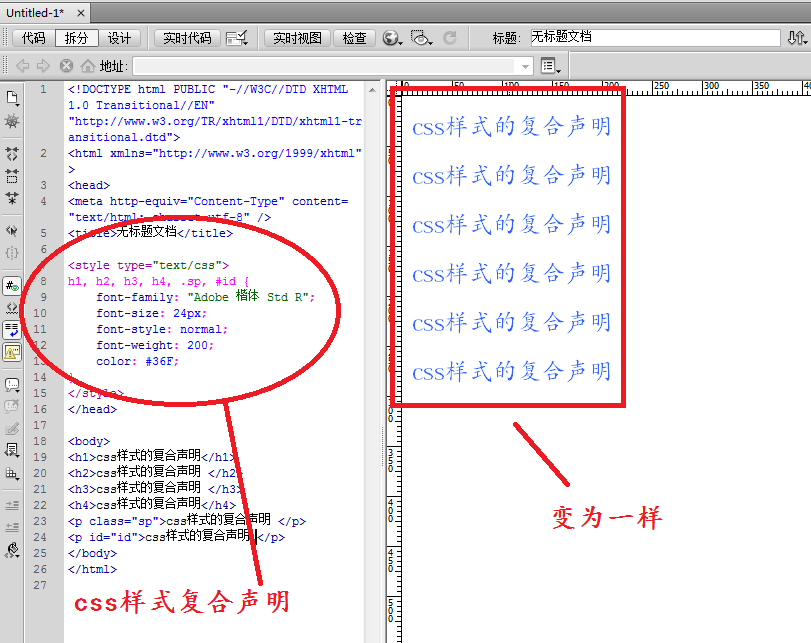 6、这样就新建了一个css样式的复合声明,所有元素的样式都为一样。