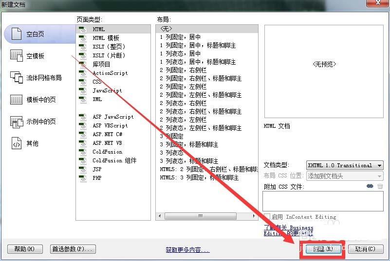 2、新建的类型默认就可以了,如果有其它需要,可以自己选择页面类型和布局等等,让点击创建按钮。
