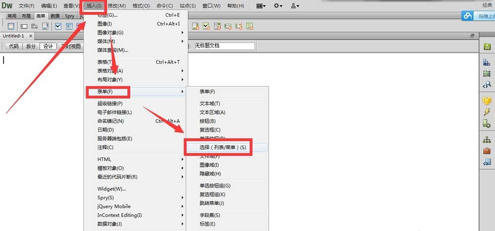 3、新建好网页之后,在设计页面,点击插入-表单-选择(列表/菜单),这样就可以插入一个可选择的下拉表单了。