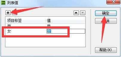 9、接着点击加号,添加新的下面标签和值,都填上女。然后点击确定按钮。