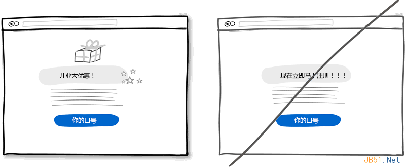 试想界面上有这样两个按钮:一个是获取折扣,另一个是立即注册。我敢打赌大多数人会点击第一个,因为第二个按扭让人感觉不到有利可图,并且注册让人联想到填不完的表单。也就是说让用户感受到获利的按钮更有可能被点击。这种让用户感到好处的文字信息也可是放在按钮旁边,不一定要做为按钮的标题。当然,正常的按钮还是有用处的,一般用于重复性操作频繁的地方。