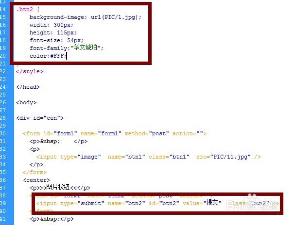 2、给新按钮定义一个样式class=btn2,设置长宽(与背景图大小一致)和背景图。