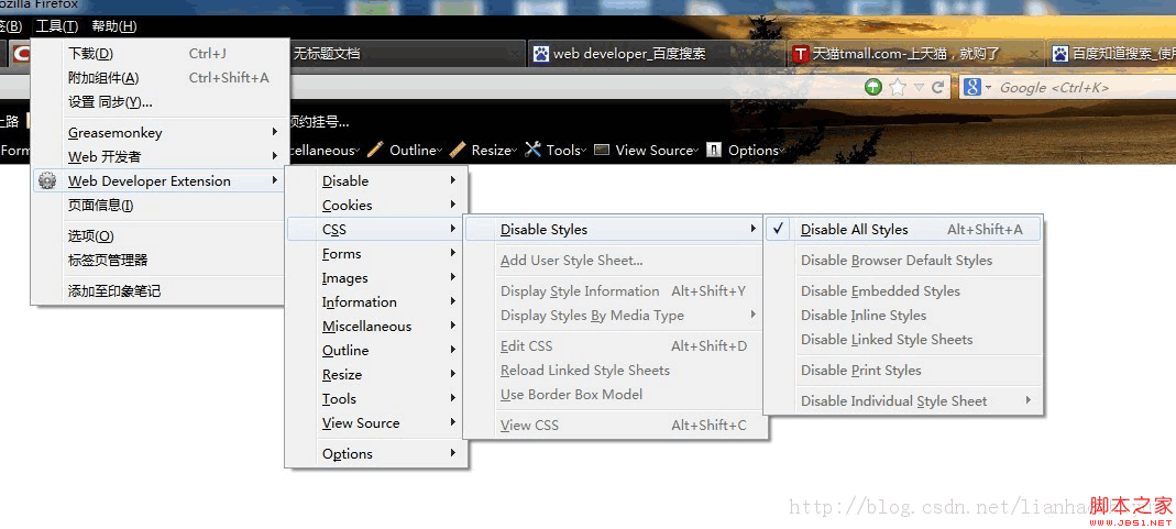操作步骤:选择工具-Web Developer Extension-CSS-Disable Styles-Disable All Stayles.