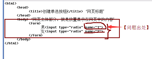 1、插入单选按钮代码后,检查一下你的name属性,预览效果