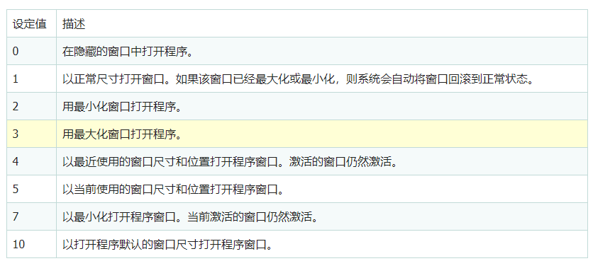 table tbody tr td设定值/td td描述/td /tr tr td0/td td在隐藏的窗口中打开程序。/td /tr tr td1/td td以正常尺寸打开窗口。如果该窗口已经最大化或最小化,则系统会自动将窗口回滚到正常状态。/td /tr tr td2/td td用最小化窗口打开程序。/td /tr tr td3/td td用最大化窗口打开程序。/td /tr tr td4/td td以最近使用的窗口尺寸和位置打开程序窗口。激活的窗口仍然激活。/td /tr tr td5/td td以当前使用的窗口尺寸和位置打开程序窗口。/td /tr tr td7/td td以最小化打开程序窗口。当前激活的窗口仍然激活。/td /tr tr td10/td td以打开程序默认的窗口尺寸打开程序窗口。/td /tr /tbody /table