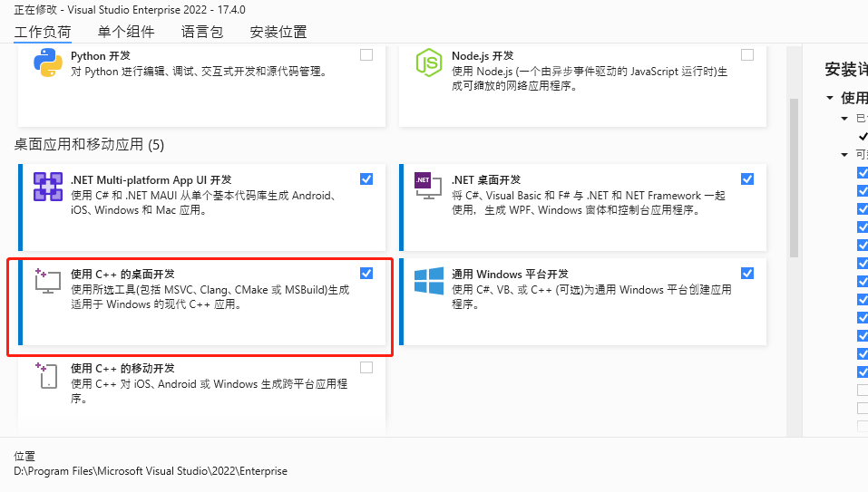 Desktop development with C++ workload是一个工具集,里面包含 C++ 开发工具,需要在 Visual Studio Installer中安装,如下图红框中所示。