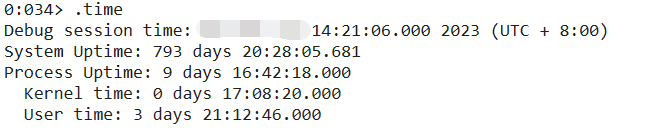 从卦中可以清晰的看到,提交内存是9G,同时Stack吃掉了3.5G,一般来说 Stack 不会有这么大,所以此事必有妖,在 TEB 中可以看到线程数高达 2405 个,这个确实不少哈,可以用!t做一个验证。
