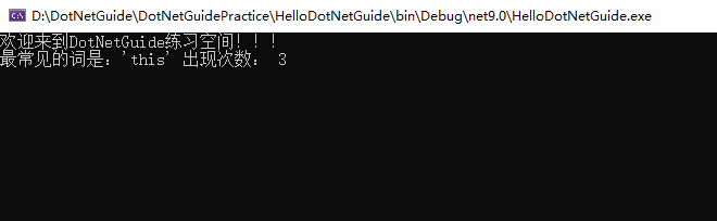 Console.WriteLine($"最常见的词是:'{mostFrequentWord.Key}' 出现次数: {mostFrequentWord.Value}");