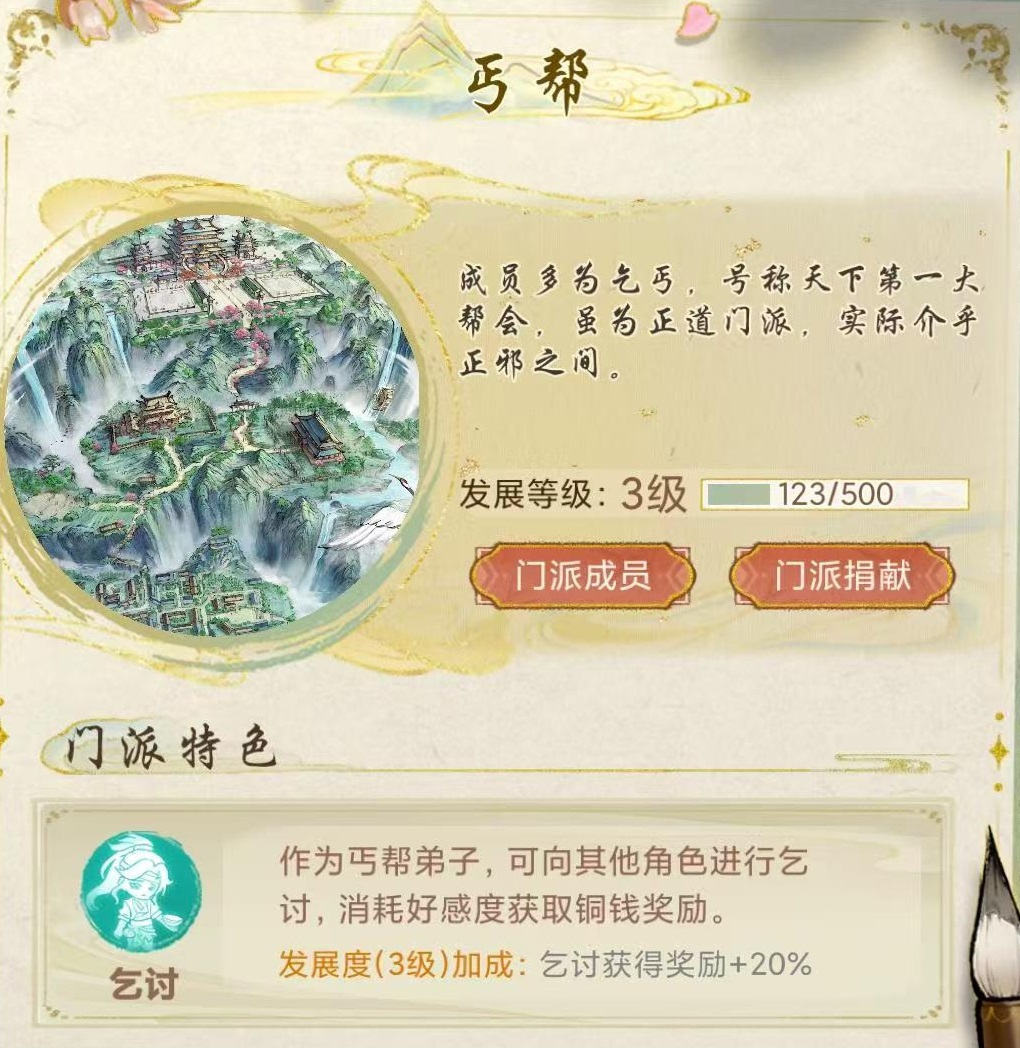 首推门派为丐帮,该门派以低门槛著称,仅需花费不超过1000银两即可顺利入门,非常适合初入江湖的新手及非氪金玩家。丐帮主打高攻速与连续打击,在战斗中具备出色输出节奏。其特有的乞讨系统允许玩家通过消耗好感度换取铜钱,助力资源快速积累。核心武学“打狗棒法”不仅招式灵活多变,还能降低对手命中率,增强战斗控制力。