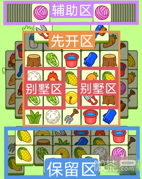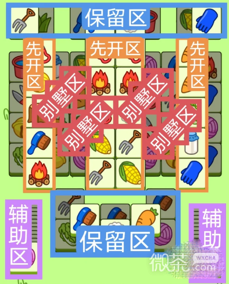 四个斜着的长形别墅组成,开局先消除橙色区,这里压牌比较多,然后按照一层层均匀消除表面牌。不要跨层太多拿牌,必要时可以用盲盒区辅助消除表面牌。尽量还是以别墅区内互相消除为主,蓝色区有叠牌,但是不多,全部保留到后期使用。