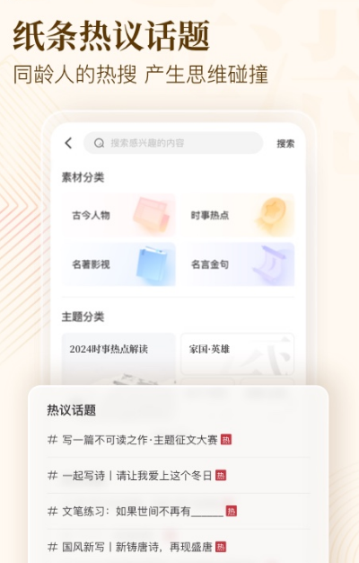 深受中学生喜爱的写作提升平台,注册用户数已达数千万。每日更新高质量写作素材,内容按主题分类整理,如中考范文、央媒金句、经典人物案例等共20类。所有资料零点准时上线,确保时效性与实用性。同时设有兴趣社群模块,鼓励用户参与观点讨论与思辨活动,锻炼逻辑表达能力,在互动中激发写作灵感。