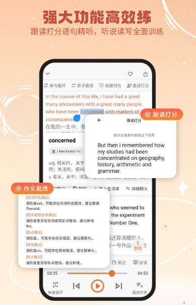 这是一款集视频、音频于一体的多维度英语学习平台,提供大量新鲜实用的外语资讯内容。用户不仅可以收听流畅的英语节目来锻炼听力,还能进行实时跟读练习,系统会对发音进行评分,帮助改善口语表达。支持多种难度级别,包括入门、进阶和专业层次,满足不同学习者的需求。平台经过全面升级,能根据个人学习数据智能推荐学习计划,并展示进步轨迹。