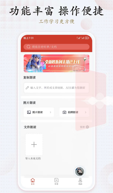 被众多职场人士青睐的多功能语音处理工具,不仅支持语音转文字,还具备文本朗读功能,内置数百种语音主播风格,可用于网页阅读、小说收听、文档播报等多种场景。界面设计简洁明了,符合无障碍操作理念,用户体验友好。无论是输入语音获取文字,还是将文字转为语音播放,都能轻松完成。