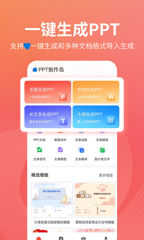一款功能全面的手机端PPT创作平台,集合了大量可免费使用的模板资源,涵盖教育课件、工作汇报、市场营销等多个领域。每个模板都配有结构化的内容框架,用户只需替换相关信息即可快速生成完整的演示文稿。除了编辑功能外,还支持将PPT导出为PDF、图片或其他常用格式,便于分享与打印,满足多样化的输出需求。