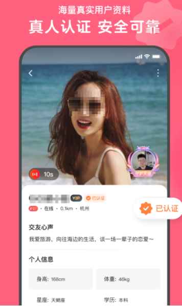 这款平台以真实性和高质量用户著称,所有成员均需完成身份验证,头像也经过真人审核,杜绝虚假信息。支持文字沟通与实时视频聊天,功能全面。用户可浏览附近异性发布的动态内容,一个简单的点赞或许就能开启一段浪漫缘分。同时,平台内置缘分速配系统,助力快速锁定潜在心动对象。