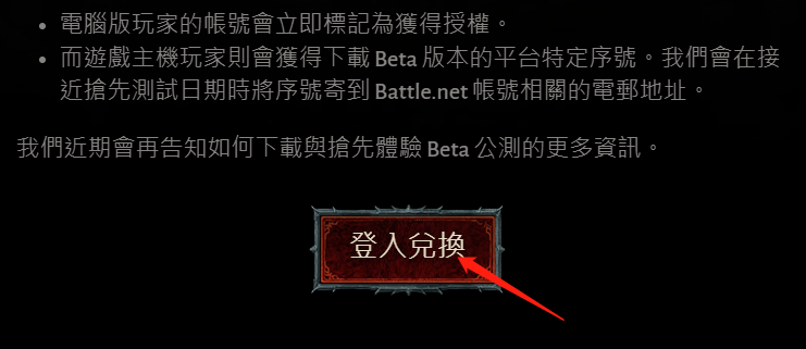 4、点击登入5、输入自己的兑换代码,并且选择平台来进行兑换就好了。暗黑破坏神4测试时间:暗黑破坏神4测试时间为3月25日至3月27日,为期三天,测试面向所有玩家。公测玩家需要去国际服去体验。
