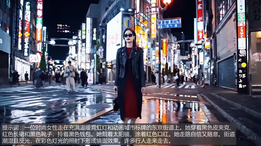 提示词内容:一位时尚女性走在充满温暖霓虹灯和动画城市标牌的东京街道上。她穿着黑色皮夹克、红色长裙和黑色靴子,拎着黑色包包。她戴着太阳镜,涂着红色口红。她走路自信又随意。街道潮湿且反光,在彩色灯光的照射下形成镜面效果。许多行人走来走去。