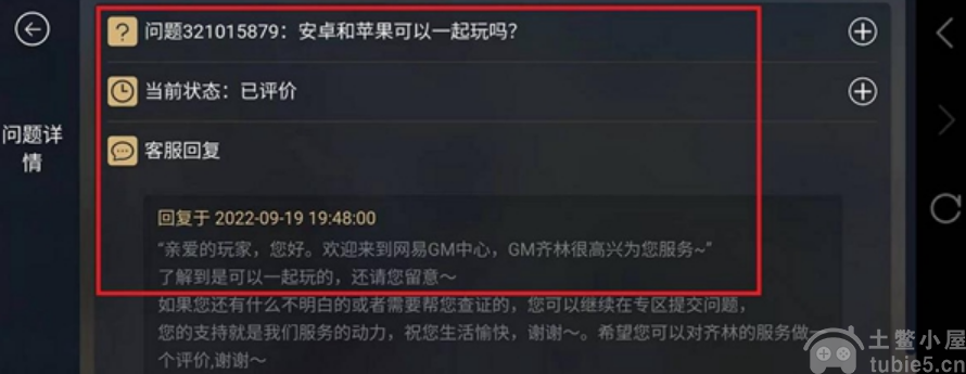 2、在客服中心页面中我们就可以跟客服提问,客服告诉我们安卓和苹果是可以一起玩的。