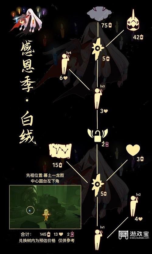 2、本次返场也会为玩家们带来白绒斗篷、赤金鸟面具和敬礼动作,一共需要145个蜡烛、13个爱心、2个升华蜡烛进行兑换。