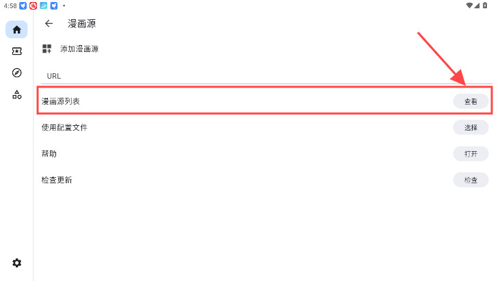 2、在出现的漫画源列表中,点击某一源旁边的“查看”按钮;