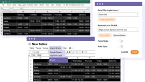 每个表格都有一个 Excel 导入和导出工具。节省大量时间,导入电子表格表格,创建布局并发布。可以导入/导出什么?可以导入所有数据 + 一些 Excel 样式或仅导入表格数据。与导入/导出兼容的样式是单元格背景颜色、字体颜色、字体大小、边框、链接(HTML 格式)。