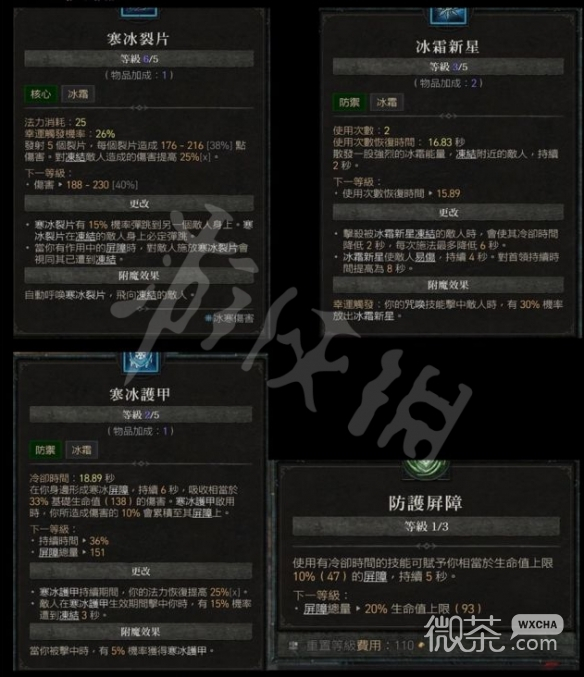 当寒冰裂片技能在自身拥有任意屏障时,会默认敌人是冻结状态,且对冻结敌人造成伤害增加25%以及100%触发弹跳效果。寒冰裂片的附魔效果是当有敌人被冻结,会自动释放此技能(不耗蓝)。