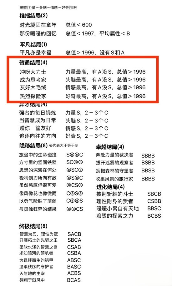 推荐养4个“普通结局”,很好养,且集齐4个在结局图鉴中可额外获得1000成长勋印。