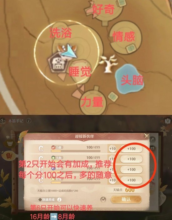 养完第1只后,后面3只重复上述过程,只是把【力量】换成对应的【头脑】【情感】【好奇】。