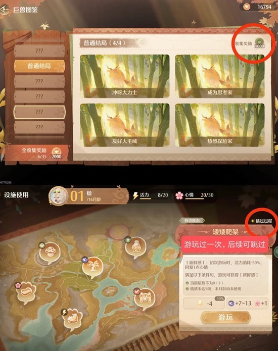 解锁【睡觉】【洗浴】和提升力量的【摇摆摆木球】,玩过一次之后记得勾选右上角的“跳过”