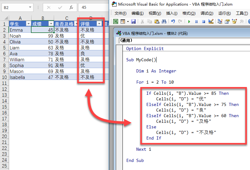 Sub MyCode() Dim i As Integer For i = 2 To 10 If Cells(i, "B").Value >= 85 Then Cells(i, "D") = "优" ElseIf Cells(i, "B").Value >= 75 Then Cells(i, "D") = "良" ElseIf Cells(i, "B").Value >= 60 Then Cells(i, "D") = "及格" Else Cells(i, "D") = "不及格" End If Next iEnd Sub代码运行结果如下: