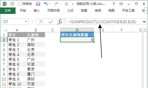 =SUMPRODUCT(1/COUNTIF(3.最后输入 COUNTIF 函数的参数,统计区域为生源地列,统计条件为所有的生源地。最后回车完成输入公式。