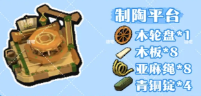 15、制陶平台:木轮盘*1 青铜锭*4 木板*8、亚麻绳*8