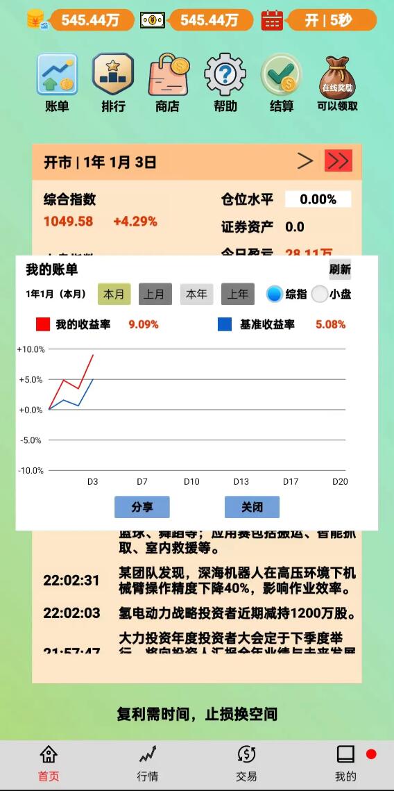 为强化学习反馈,游戏内置操盘成长体系,包含胜率统计、盈亏曲线回溯、单票收益率分析等功能模块。成就系统覆盖从首笔交易达成、单日盈利突破万元、连续十日正收益到跨周期资产翻倍等多个里程碑,全面记录玩家在模拟市场中的进阶轨迹。