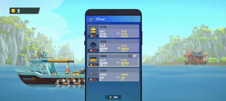 第三天早上升级装备潜水服3级,装载箱4级负重28~41kg,算上任务给的金币刚好够升,剩余3金币,今天下海抓了三齿鲨头2.5kg+两条锯齿鲨26kg的肉+拾取其他有价值的物品+一块虎鲨肉15kg凑到56kg,后来发现其实不应该抓虎鲨的,抓了没用,因为抓虎鲨没抓河豚导致第四天的河豚冻差点没升到4级,略有遗憾,今晚卖全烤三齿鲨头,缺的菜用锯齿鲨寿司补上