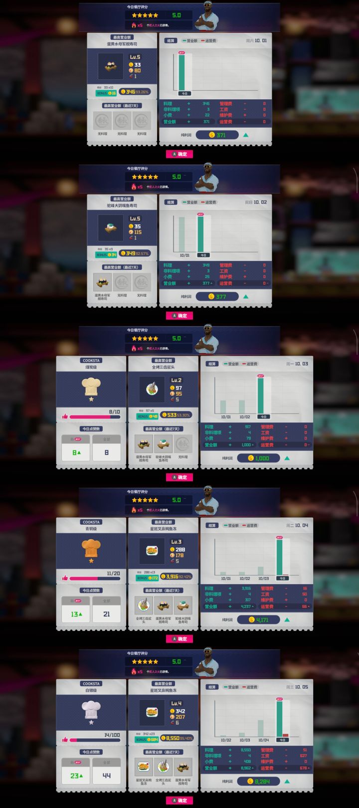 第五天,依旧钟乳洞窟图收集海葡萄水母寿司食材备用,继续抓河豚冻食材卖,晚上花4000金币招募厄尔尼诺,拉乌尔,达比纳,派,开始卖河豚冻,边卖边给厄尔尼诺和拉乌尔升级,一直升到了7级,然后卖了9份时第一时间点COOKSTA升级到下一级白银,然后继续给达比纳升级5级,派升3级,杏子派遣盐,达比纳和派去找酱油,别忘了400金币发布员工雇佣